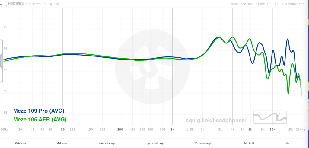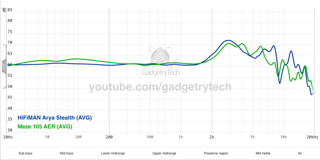 It’s surprisingly hard to find anyone who has measurements online for both the Arya Stealth AND the Meze 105 AER, but here GadgetryTech comes to our rescue. And as expected based on my subjective listening, the 105 have slightly better base response and less spicy treble.14