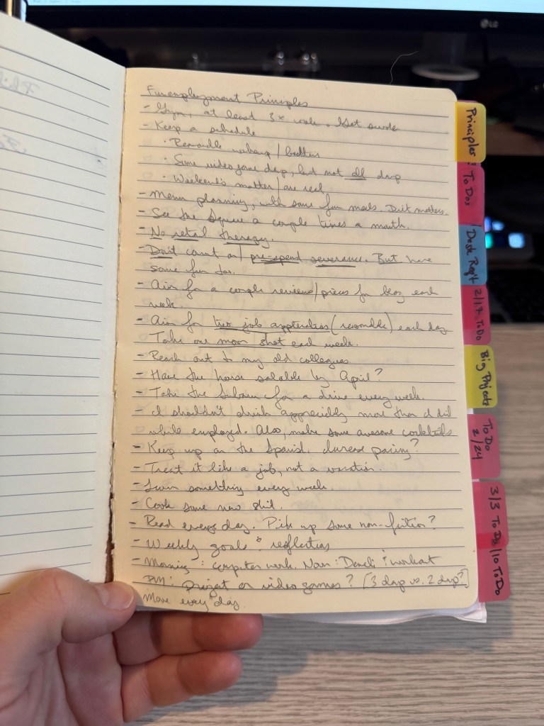 I threw myself into the mission of finding a job. I wrote two pages of “Funemployment Principles,” to-do lists, project lists for my house in the event that I needed to sell, and long-term goals that I wanted to make meaningful progress on. I made ambitions plans to exercise every day, to accelerate my Spanish learning, to teach myself to do 3D modeling, and to really master woodworking. And in the end … I did some of it. I didn’t get my custom desktop built, but … well, it’s weirdly hard to get anyone to sell you a live-edge slab in Olympia, apparently. I haven’t done my drywall repairs, but honestly that’s a crappy task to try to do when you can’t have the doors and windows open for dust control, so that’s probably better left for this summer anyway.
