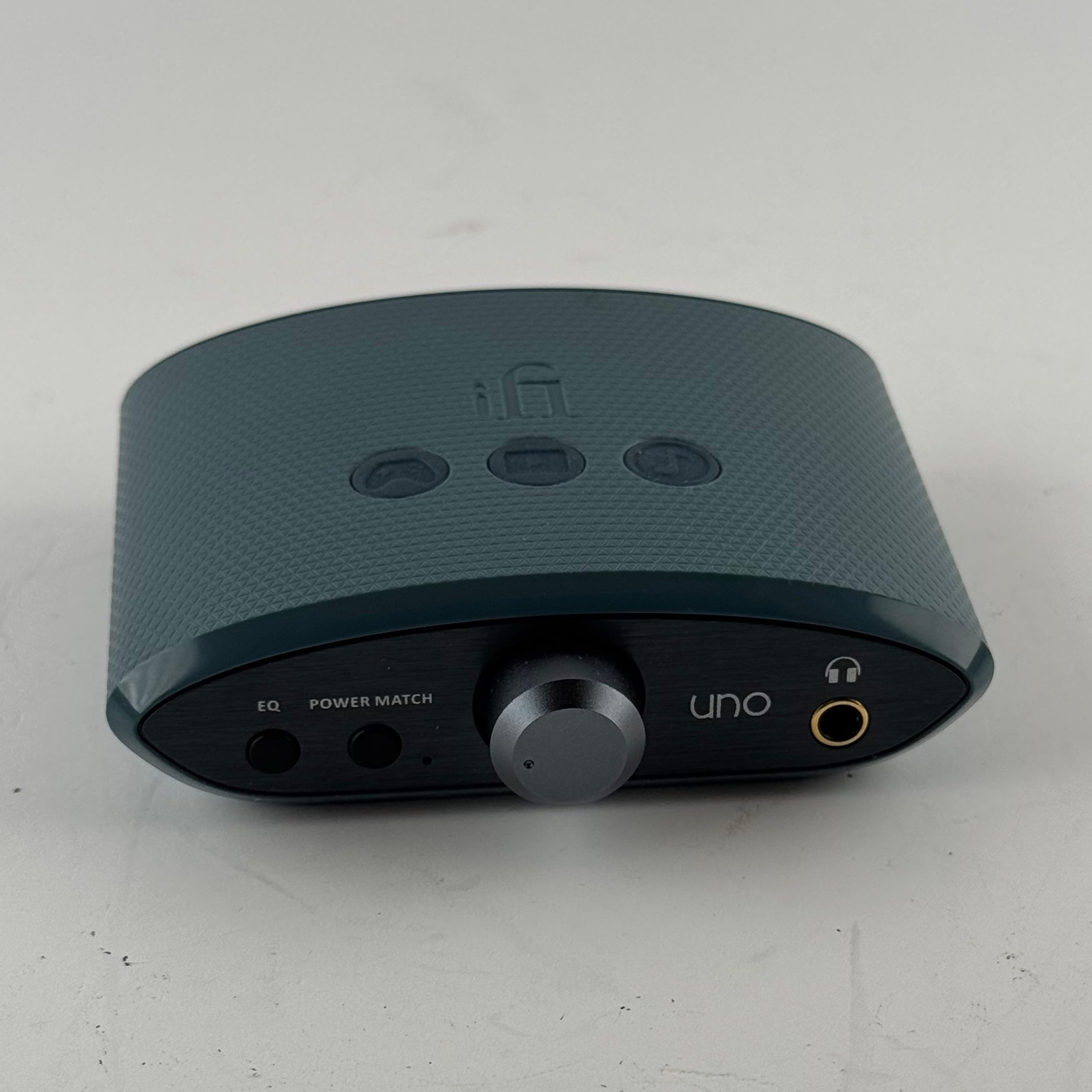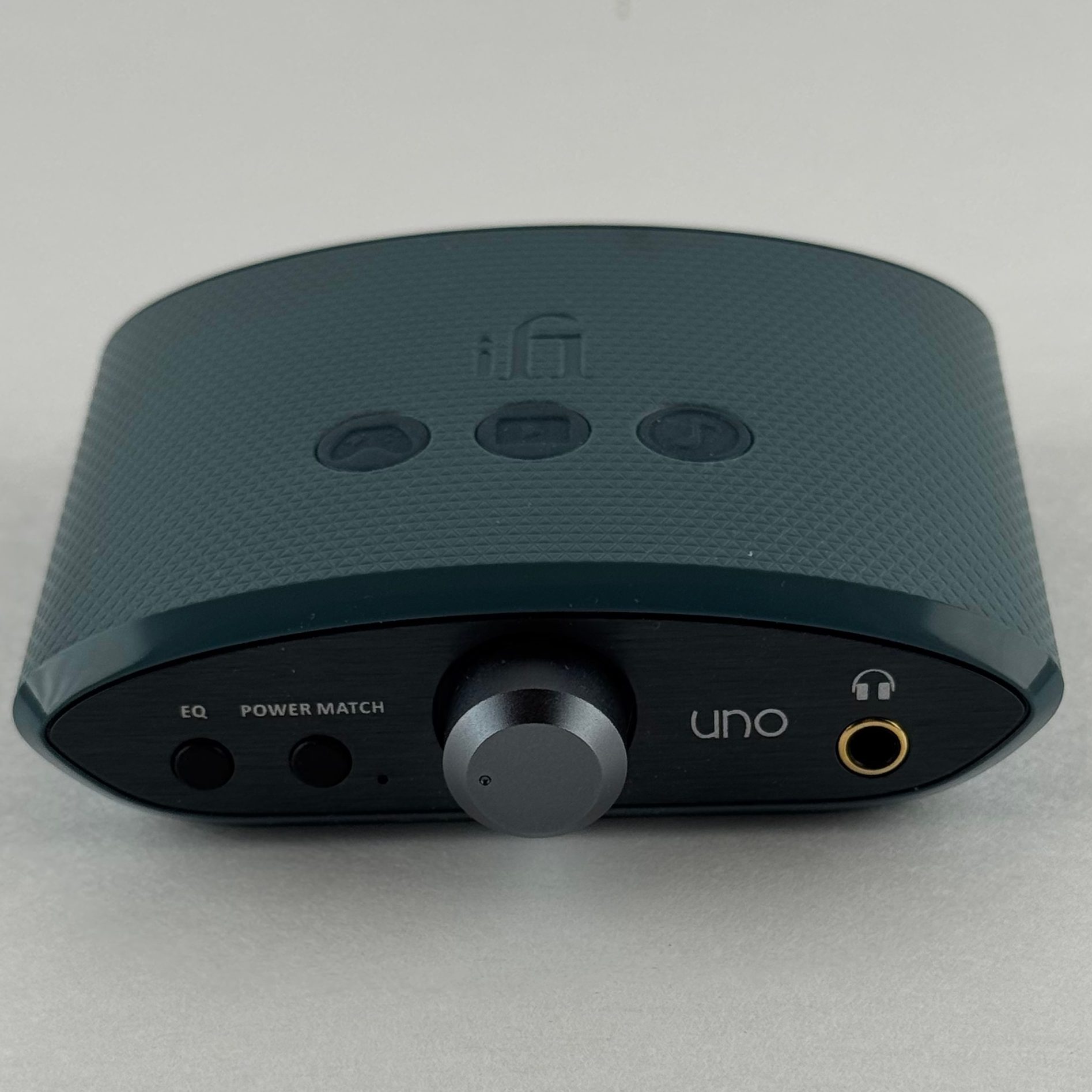 The Basics. The iFi Uno is a USB-C powered DAC/amp unit with four EQ modes (off, gaming, movies, and music), a “power match” mode (aka a high-gain setting), and both 3.5 mm and RCA outputs. It’s a pretty capable DAC, with support for DSD, MQA, and “Hi-Res Audio.” It connects to a source via a single USB-C cable providing both signal and power. It’s a pretty small, lightweight unit, measuring 3.5” x 3” x 1”, and is cased in a blue/grey plastic shell. The biggest selling point for me was the plastic physical volume knob on the front, something often lacking at this general price point. It puts out slightly more than 200 mW into 32 Ohms; not bad for a USB-C driven unit.