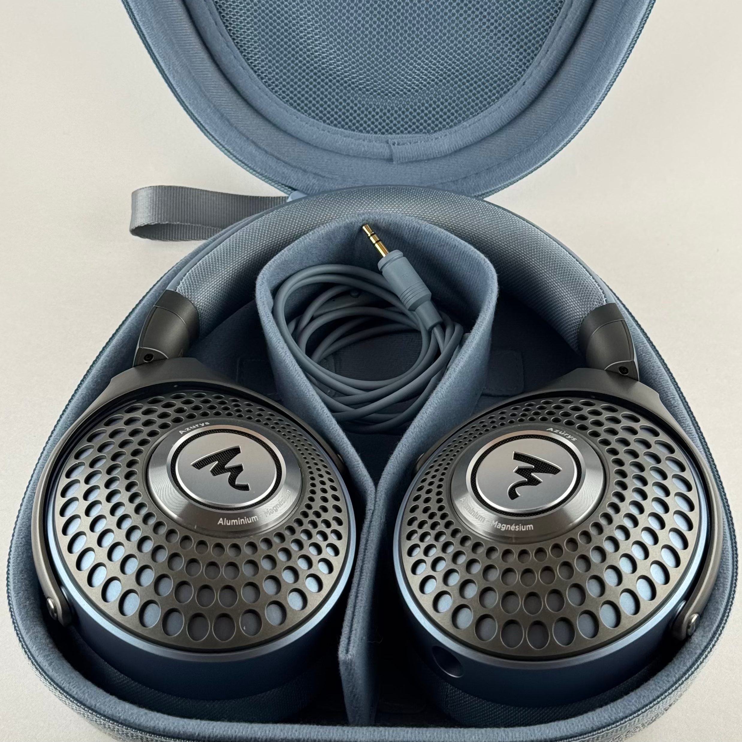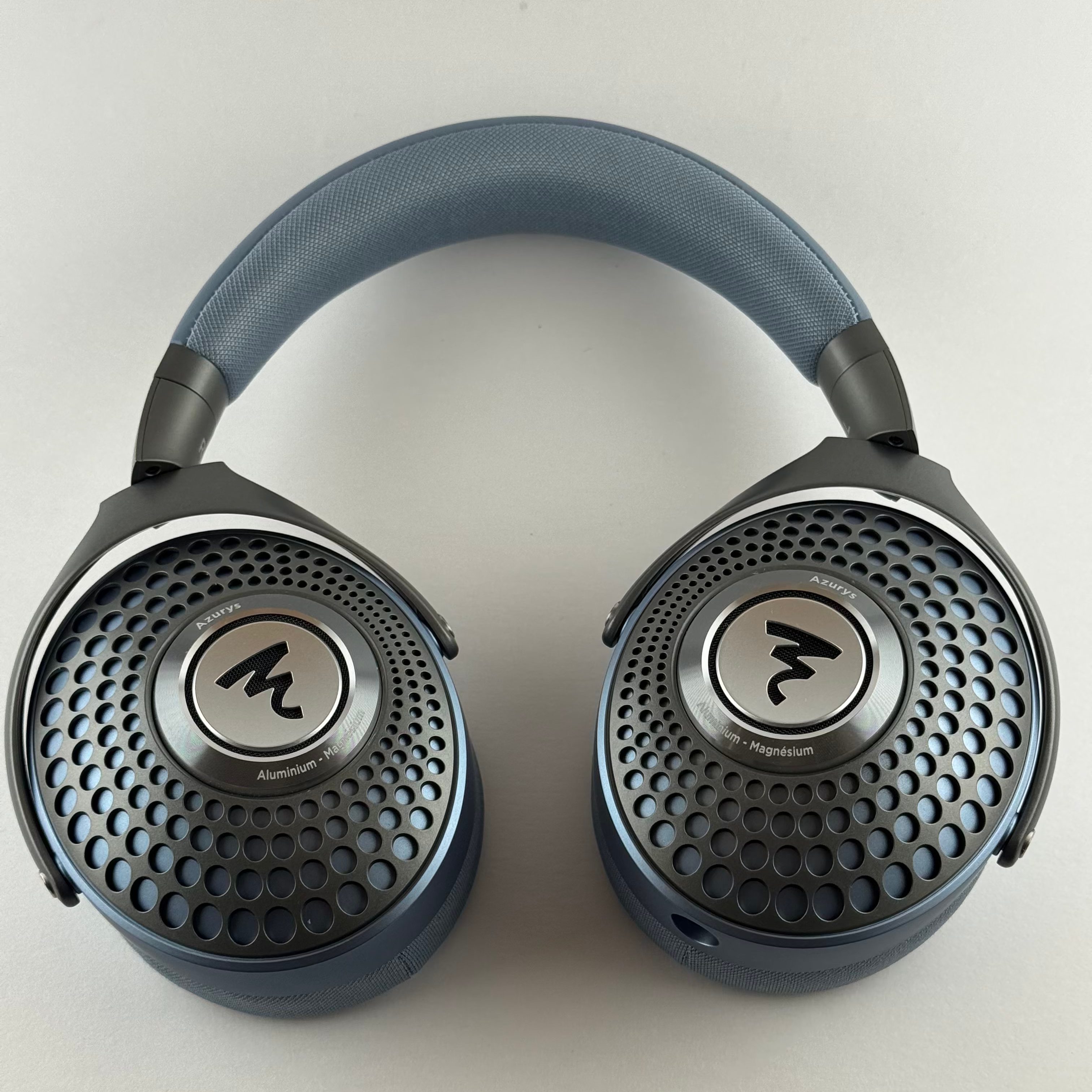 The Azurys (ah-zurr-ees?) is a passive, mid-fi closed-back headphone produced by reknowned French audio company Focal. It’s relatively easy to drive, with a nominal impedance of 26 Ohms and a sensitivity of 100 dB/mW. It shares the smaller form-factor3 of the Focal Bathys (Focal’s entry in the wireless ANC market) and Hadenys (the open-backed sister headphone), as well as their single-entry cable making this a single-ended-only headphone. It is made in a single colorway at this point, a nice light blue. It’s a reasonably light headphone, coming in slightly over 300 grams.