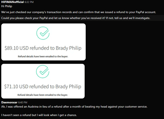 • Days Hifiman did not communicate with me before finally issuing a refund: 7