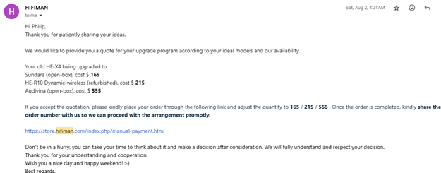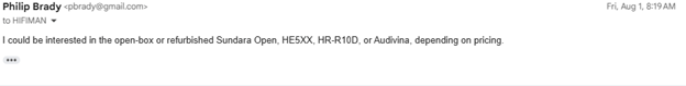 23. My first experience with a named Hifiman e-mail account, rather than the generic customer service account. ↩︎
