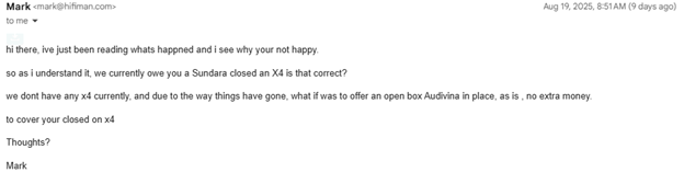 • Mark responds, suggesting that Customer Service didn’t know what was going on and offering to sell the Audivina to me for the amount refunded for the Sundara Closed & HE-X4 ($160).
