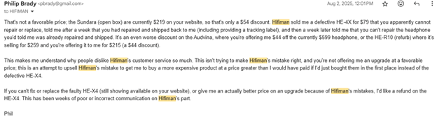 Not ideal, but fine. It’s an unusual model, and Hifiman has a bunch of products that I was interested in, so I was open to this route. At this point, I was still pretty fine with the customer service I’d received. Sometimes products are out of stock, and the HE-X4 was an odd model that appears to be out of production. I was confused as to why they’d told me they were being shipped back to me, but I was open to a solution that would have made me whole. I really liked the HE-X4 overall, but this was my (still polite, but bemused) response18:
