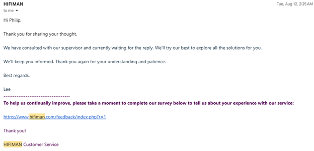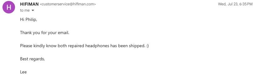 This was the last communication I got from customerservice@hifiman.com, other than a brief response on August 15th acknowledging that I’d asked for an update.