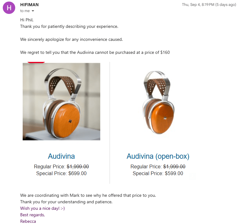 On August 18th, almost a month after I shipped my headphones back to Hifiman, I got an e-mail from a person named “Mark.”23 It was a surprisingly hope-inducing e-mail; acknowledging that I was reasonably unhappy with this series of events: