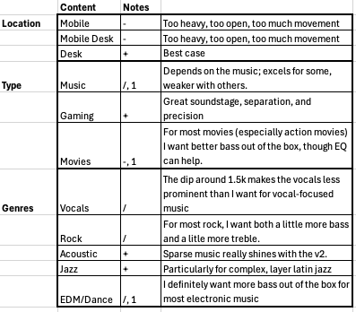 - I score bass, mids, and treble on a two part scale: 1-5 for quantity (5 being the highest), and A-E for quality (A being best in class, E being laughably bad). For soundstage it’s also a two part scale, with the number representing the width and the letter the separation within it. ↩︎