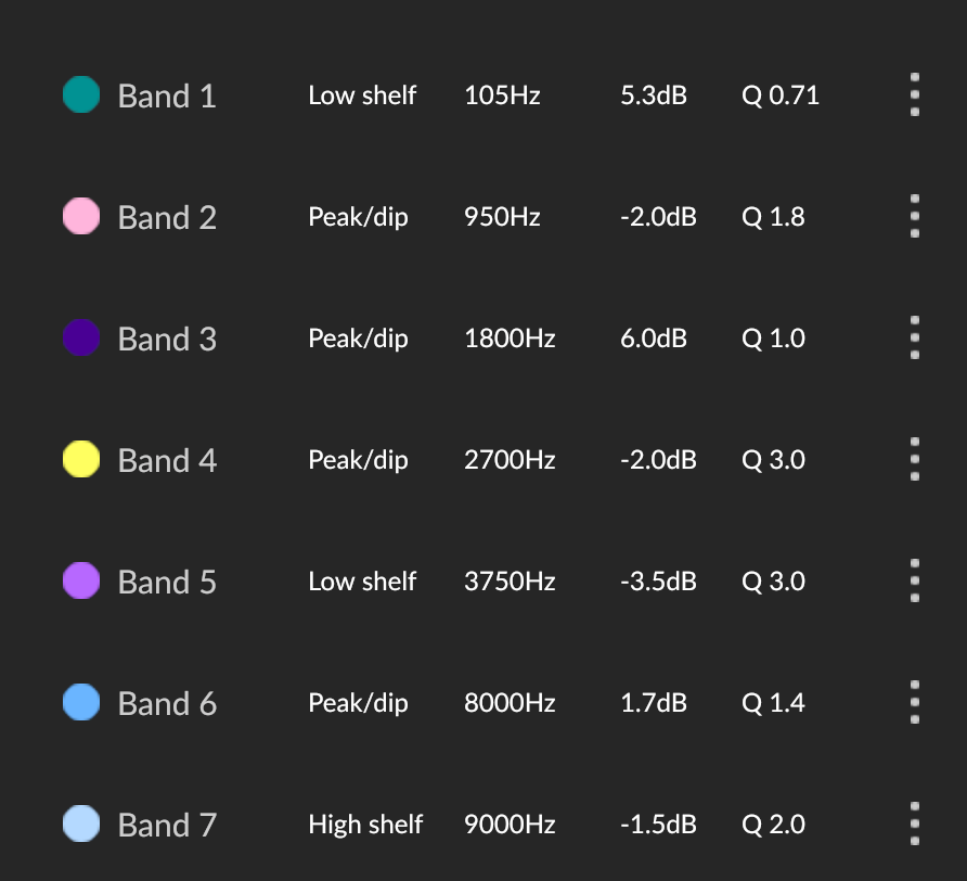 [EQ Update: After some fiddling around, this is where I’m at now. It’s … close? The bass is much richer and the overall sound is more complex, though there are still a few little treble things that I don’t love and I think I’d still like a little more in the mids.]