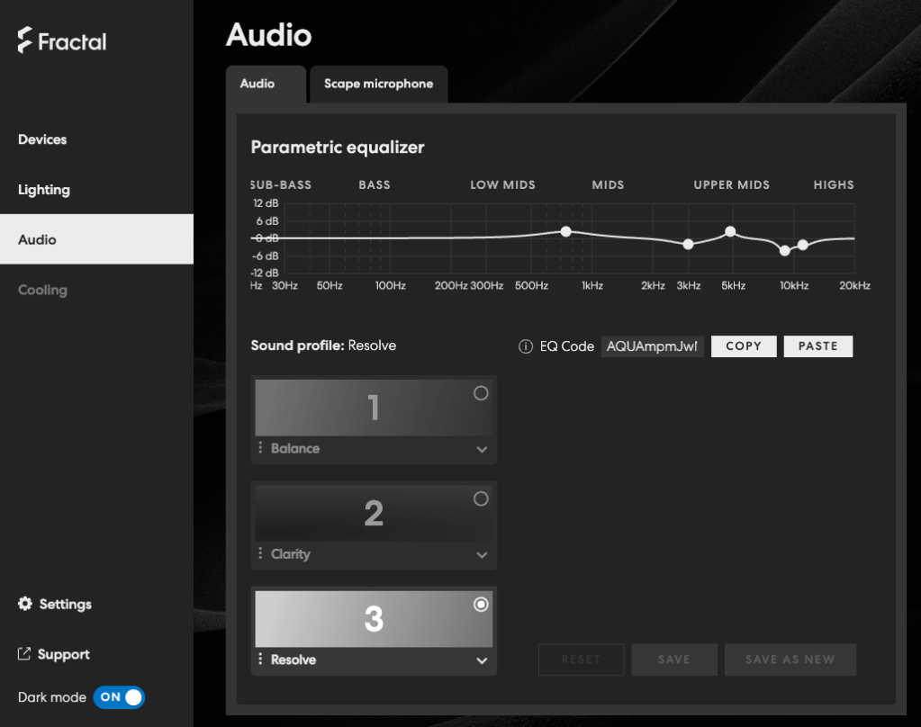 The Scape has a really excellent and interestingly social equalization (“EQ”) system. It’s browser-based, and allows you to share your EQ settings with anyone using a custom EQ code. As someone who’s spent a lot of time copying and entering parametric EQ codes, I find this system hilarious and delightful, and not only because some people have come up with some genuinely WEIRD profiles and it’s fun to play around with.