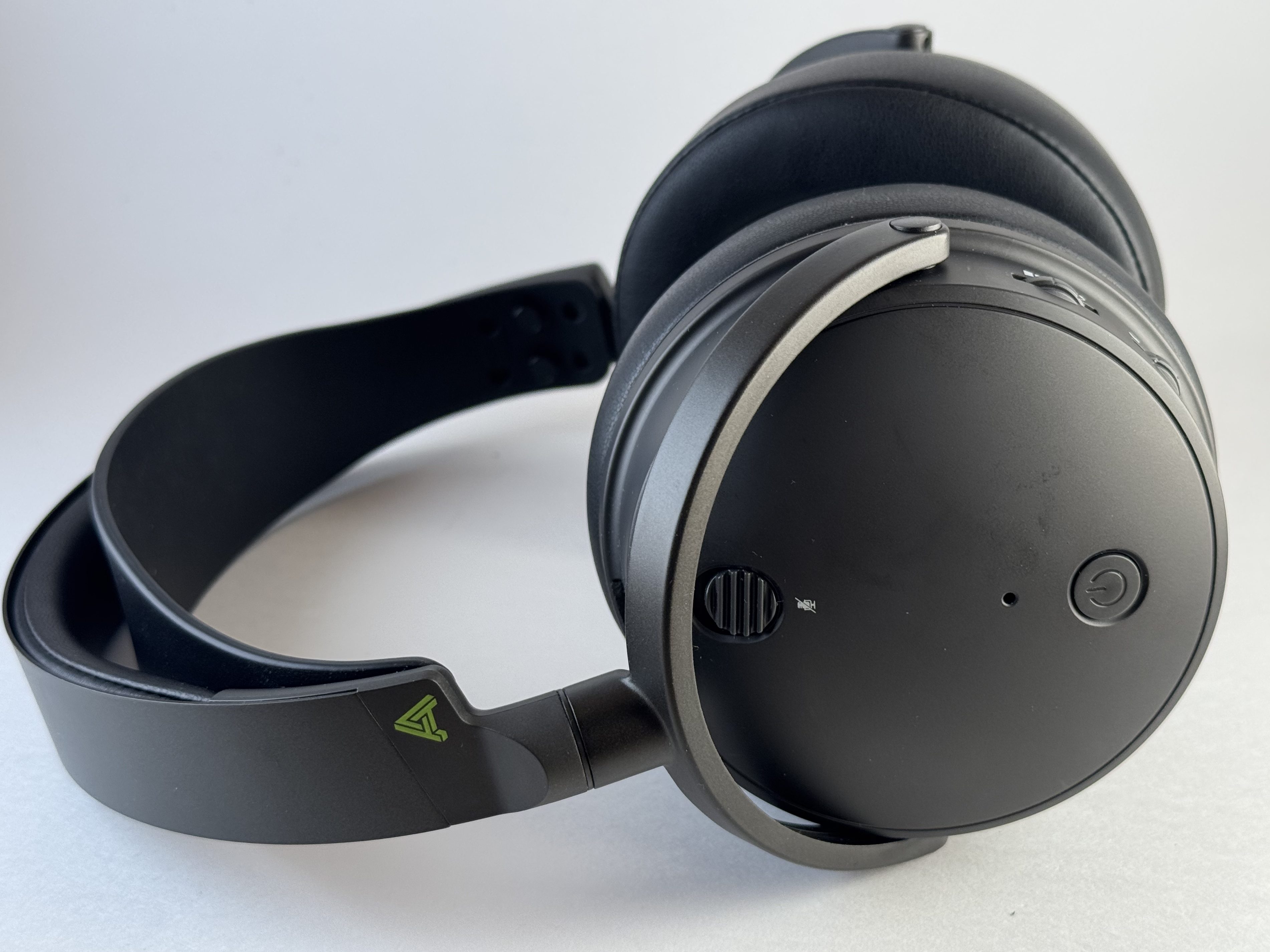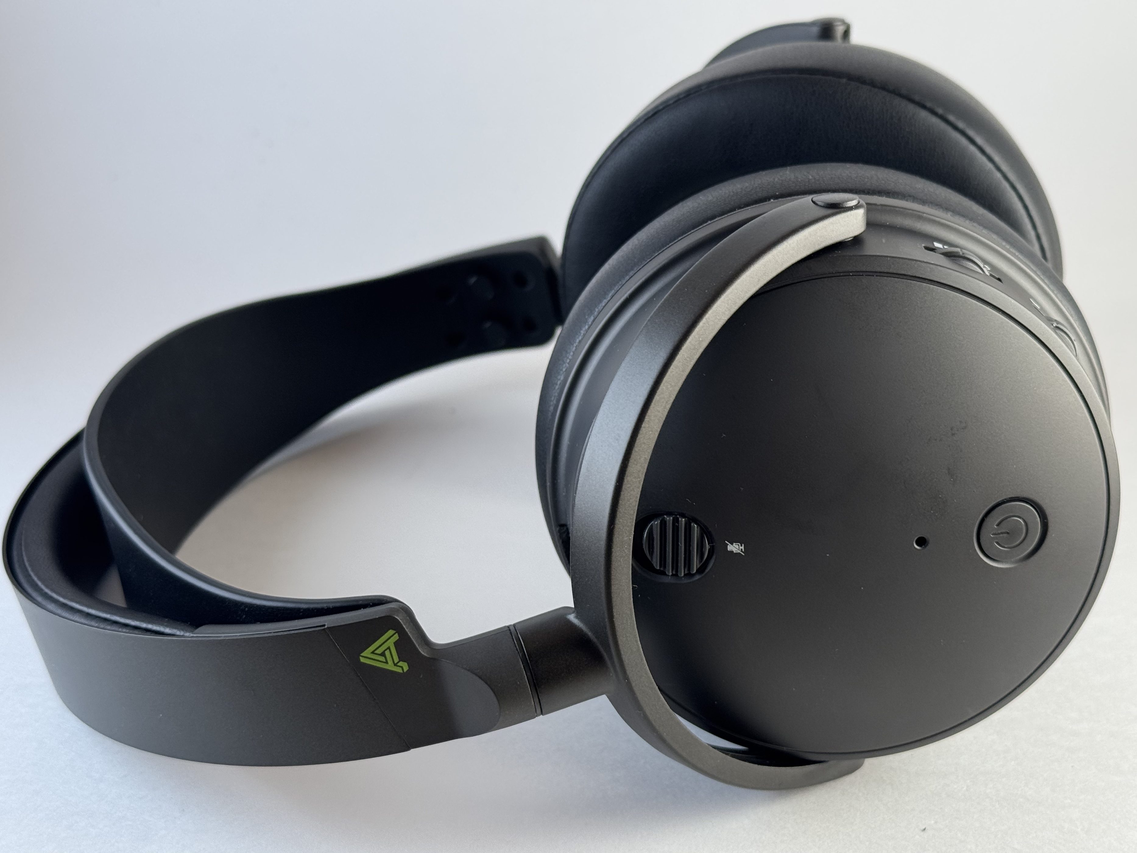 Controls. The controls on the Maxwell are all physical buttons, which I really like and appreciate in a world of touch sensors. On the left ear cup, from top to bottom on the back you have a volume wheel (scroll for volume up and down, press and scroll for next/previous track, double press and scroll for EQ presets), a mixer wheel (scroll to change chat vs. game volume, press and scroll for sidetone adjustment, and double press to turn off sidetone), the 3.5 mm port, the USB-C port (charging and DAC mode), the boom mic port, and a button to turn on/off “AI noise reduction.” The power button is on the outside of the left ear cup towards the bottom (press to turn on, press and hold for 3 seconds to turn off, while turned on press to pause/play), and there’s a slider on the outside towards the top for muting/unmuting the mic. No controls on the right cup.