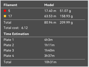 In total, this prints in a little more than 10 and a half hours, and will run you a little less than a quarter spool of filament (160 grams of PLA/PETG and a little more than 60 grams of a TPU), if you don’t have any printer issues.