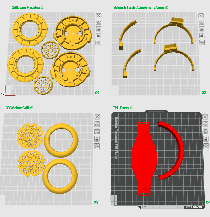 The best way to print this project (or most projects, really) is in small batches of just a single part or paired parts, but I tend to set my printer for longer prints overnight. I’ve printed this a couple of times in four plates on the P1S/A1, arranged this way:
