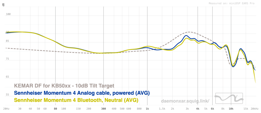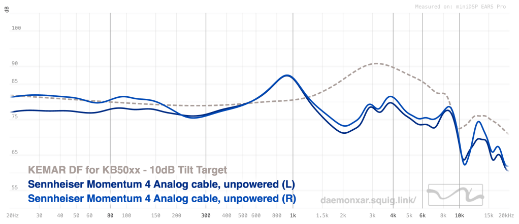 I commented somewhere that I thought the M4 running via analog cable and powered was roughly the same as the default “neutral” tuning via Bluetooth, with maybe a hair more treble energy, but I was willing to believe that was just in my head. Turns out … at least according to this measurement, it is just a hair more trebly (though well within the potential range of measurement error). Functionally, though, running via analog and powered on is the same as running in “Neutral” via Bluetooth (or USB-C, for that matter):