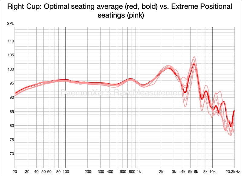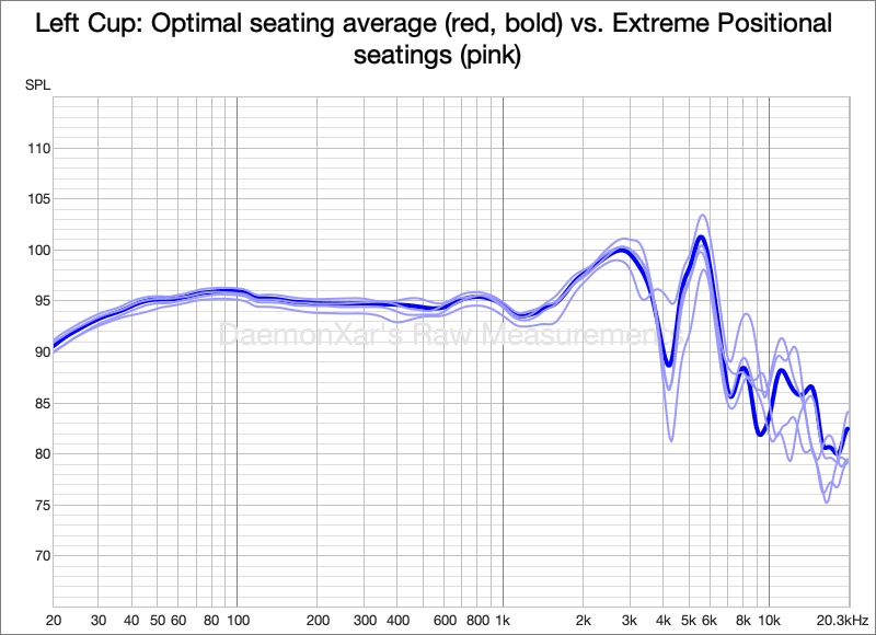 It’s worth noting that the Aeolus’ sound is pretty consistent whether it’s seated optimally or in extreme positions. As you can see below, even seating the cups as far forward, backward, up, and down as I could on my rig mostly didn’t affect the seal or shift the frequency response very much, especially below around 4 kHz: