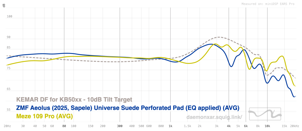 I’m actually a little surprised by how big that delta below 125 Hz is; as I’ve been doing a lot of critical listening with the Aeolus I’ve been gradually bumping up a bass shelf centered around 50 Hz, and by comparison I’ve legitimately never listened to the 109 Pro (consistently -5 dB quieter below 125 Hz) and thought to myself that I needed to add a bass shelf. Now I’m curious to go back to see how they do with a little extra sub bass! I’m also a little surprised by how much stronger the Aeolus’ response between 1.25 kHz and 3 kHz is; it certainly doesn’t sound that way to me for music, which sort of strengthens my growing belief that I personally care a lot more about overall balance and relative tonality than I do about target compliance.