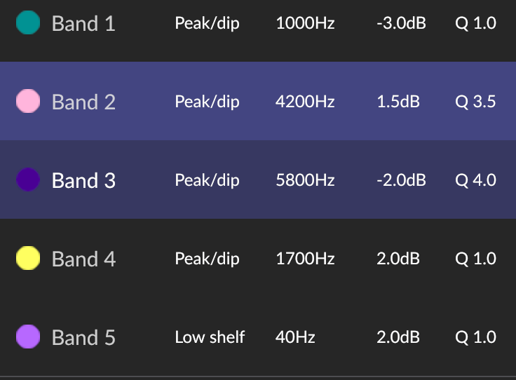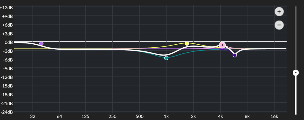 EQ: The Aeolus is a fun, interesting tune that doesn’t need EQ,7 but they do shift in interesting and potentially pleasant ways when you do spend some time fiddling with them. I started with a relatively straightforward profile from a user called gointendo on Head-fi.org with some comments from a user called Arghavan, then fiddled a bit (and added a bass shelf to address the roll off). Here’s what my EQ profile looks like: