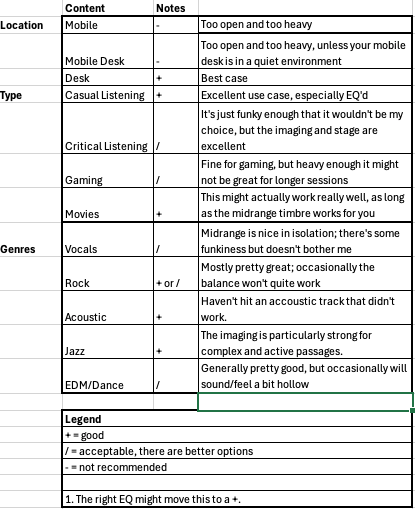The soundstage on the Aeolus is really well done. It’s pretty wide, with the rhythm guitars on “Chan Chan” pretty far out to the left and the right, though many of the instruments (particularly those in the center of the imaging) are a little behind my head rather than in front. The wandering guitar on “Love Can Damage Your Health (Laid Mix)” for example is pretty good front-to-back. Though the guitar mostly doesn’t cross in front of you, it definitely passes through your head and then circles around behind.11 The toms on “Thunder Lightning” are a little more subdued on the Aeolus12 than on some other headphones, but are nicely placed in space. The instrument separation is also pretty exceptional; “Chan Chan” is a very crowded (and incredibly well-recorded!) track and I can place every single musician in space; I’m not sure I realized where the hand percussion was in relation to the vocalists until I listened closely with the Aeolus. These don’t image quite as well as something like the Hifiman Arya Stealth, but they are impressively close for a dynamic driver, particularly an older one.